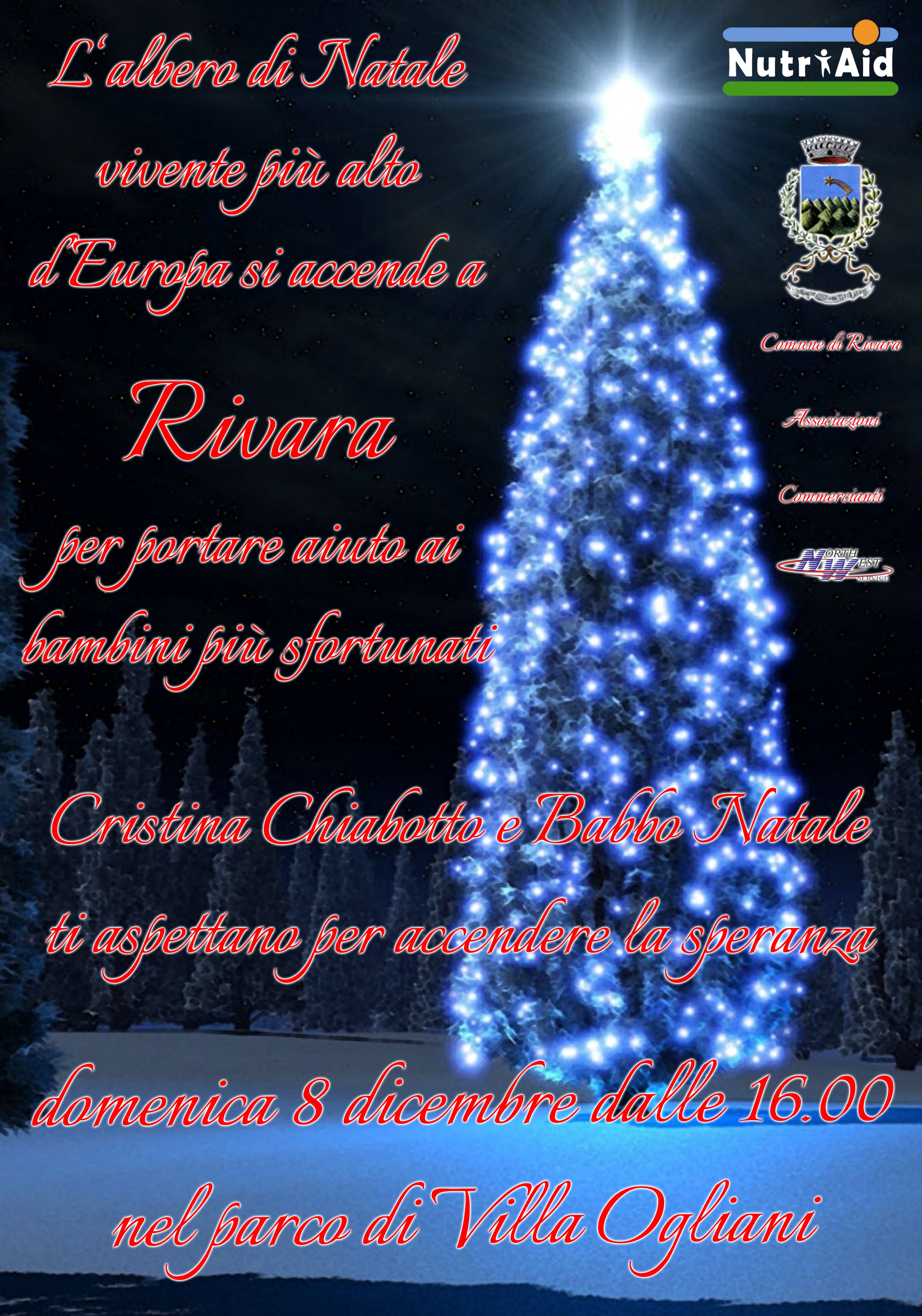 L'albero di Natale vivente più alto d'Europa si accende a Rivara per portare aiuto ai bambini più sfortunati con CRISTINA CHIABOTTO e BABBO NATALE nel Parco di Villa Ogliani alle ore 16.00.