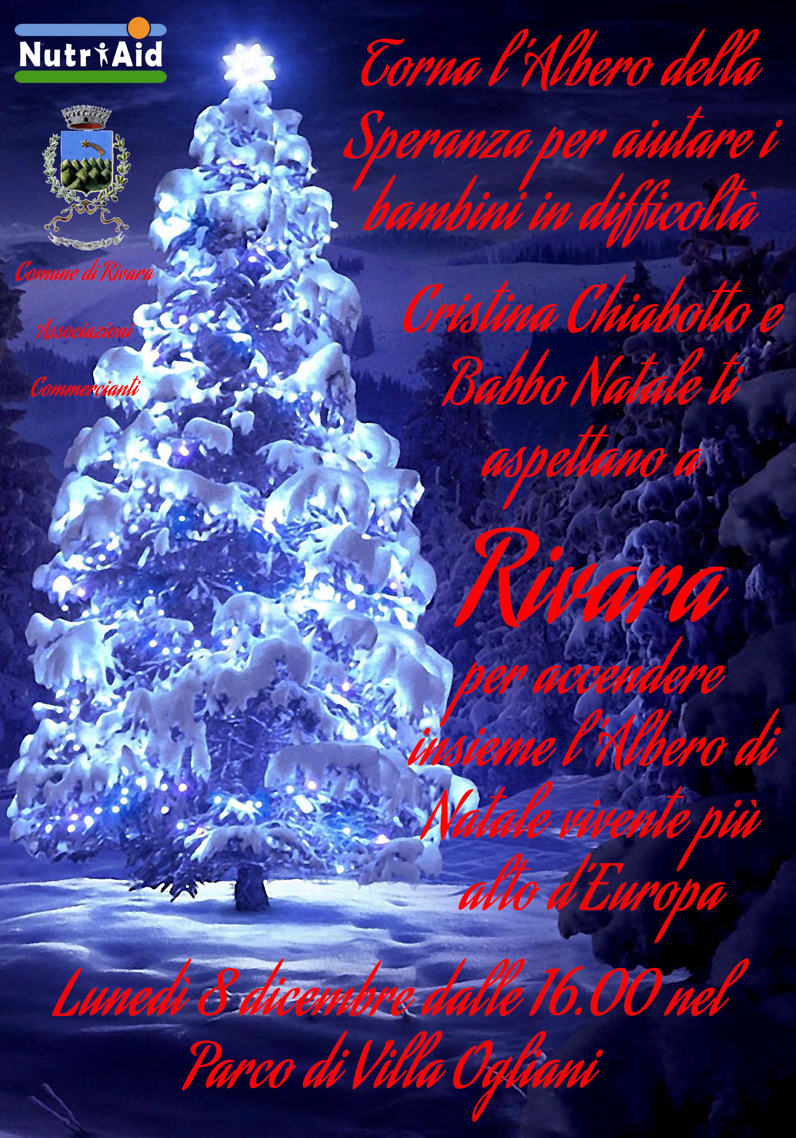 L'albero di Natale vivente più alto d'Europa si accende a Rivara per portare aiuto ai bambini più sfortunati con CRISTINA CHIABOTTO e BABBO NATALE nel Parco di Villa Ogliani lunedì 08 dicembre alle ore 16.00.