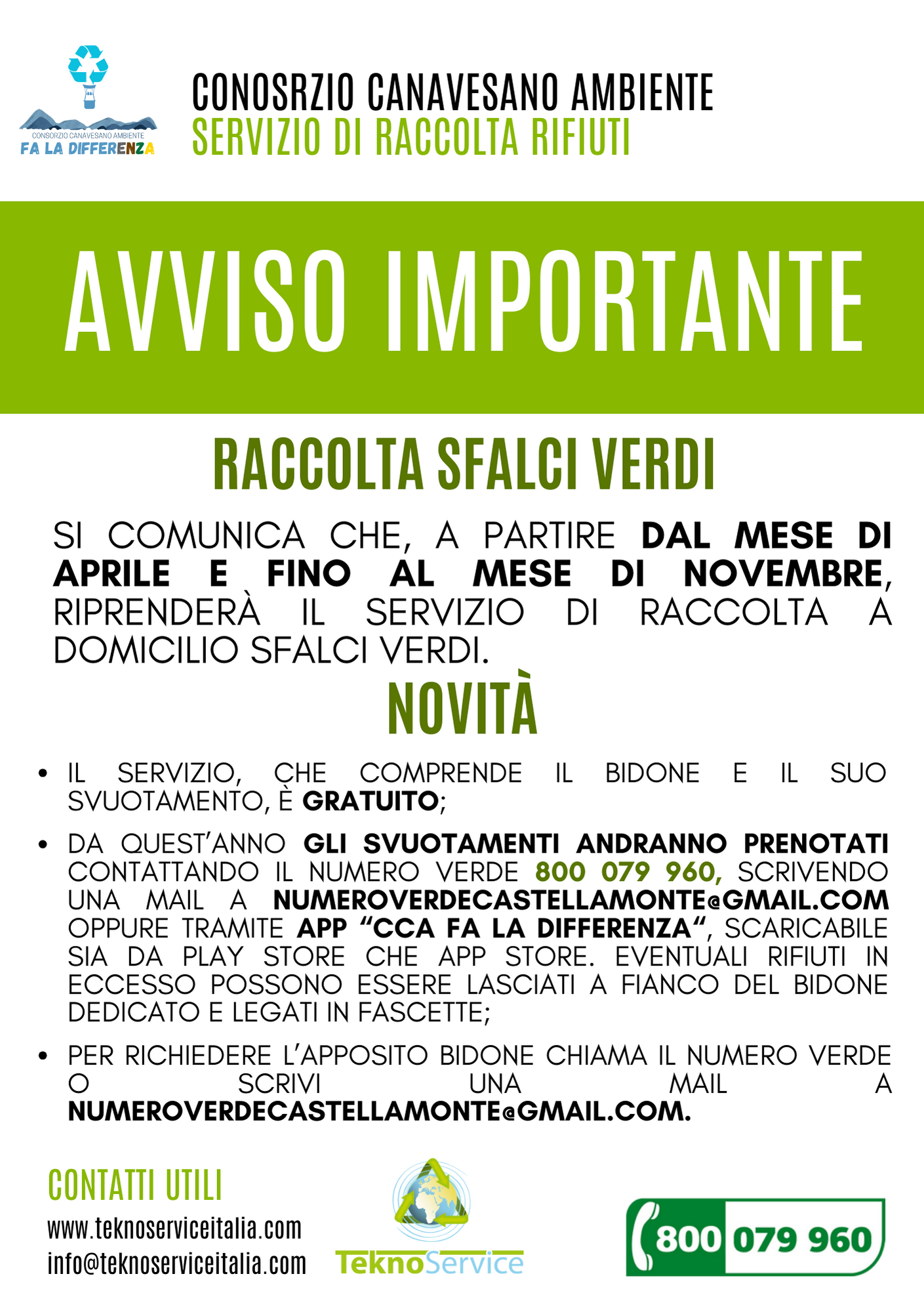 - mail all'indirizzo numeroverdecastellamonte@gmail.com