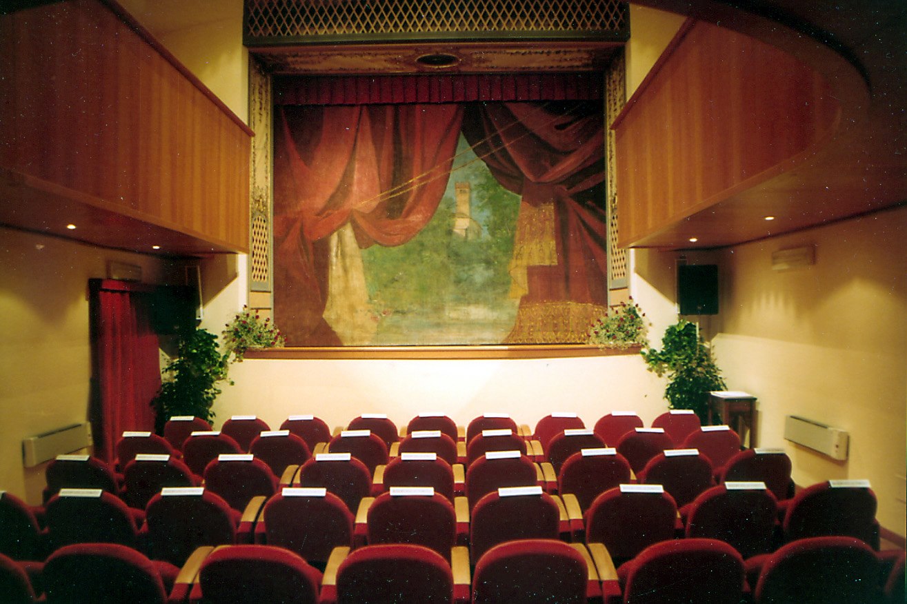 Il risultato è il teatro che vediamo oggi, con lo stupendo sipario dipinto (attribuito a Pittara e raffigurante il Castello Vecchio) e l’elegante facciata decorata. Il portone d’ingresso venne donato dalla famiglia Ogliani e proviene dalla cappella, oggi non più esistente, del castello. È interessante notare come all’epoca gli spettatori assistessero in piedi alle rappresentazioni, cui seguivano balli in cui si esibiva l’orchestrina che in precedenza aveva accompagnato lo spettacolo.