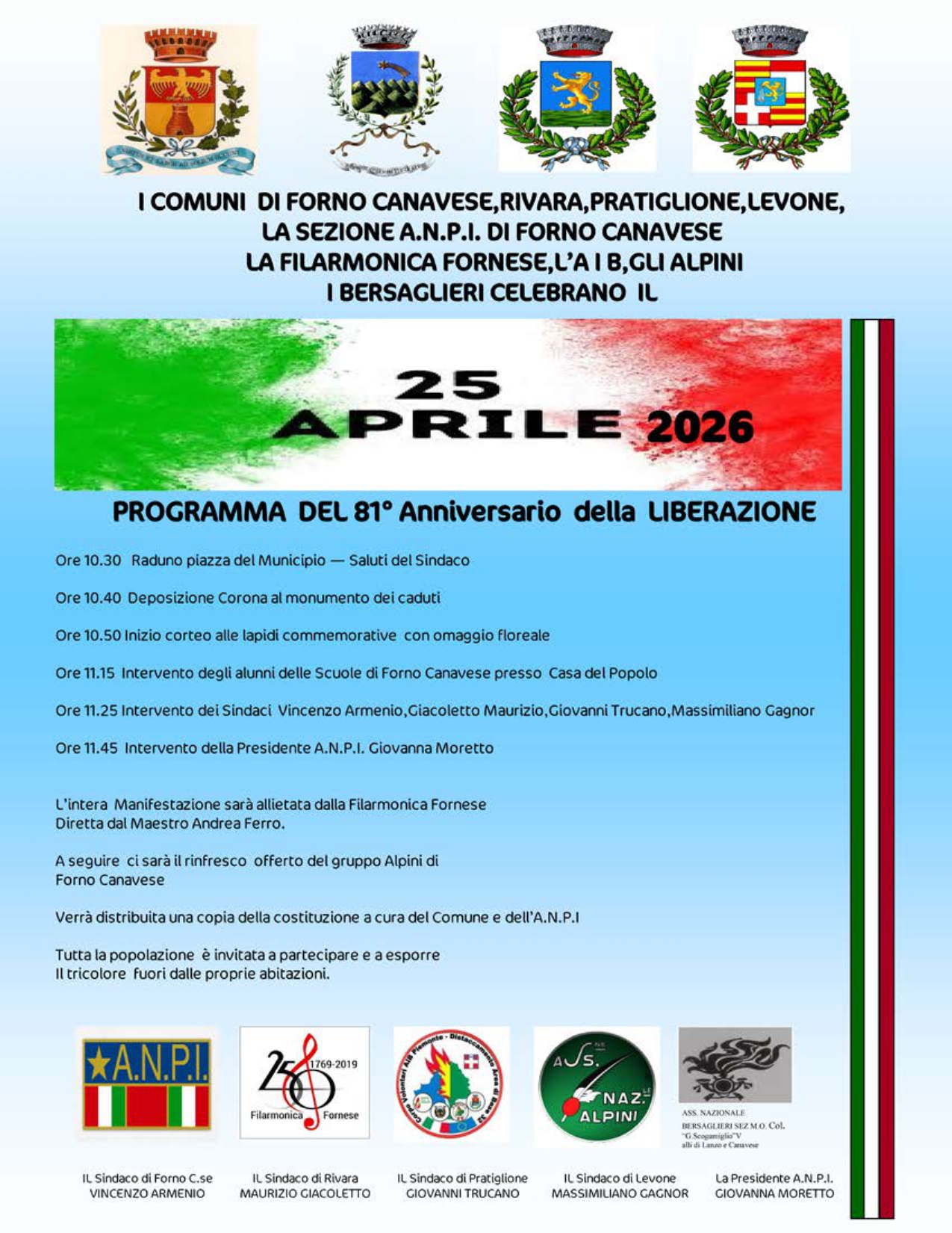Manifestazione per l'81° anniversario della Liberazione organizzata dai Comuni di Rivara, Forno C.se, Levone e Pratiglione