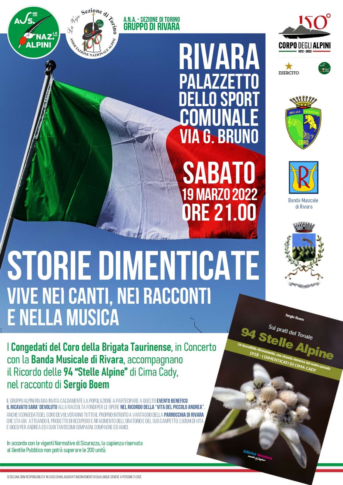 I Congedati del Coro della Brigata Taurinense, in concerto con la Banda Musicale di Rivara, accompagnano il ricordo delle 94 "Stelle Alpine" di Cima Cady, nel racconto di Sergio Boem, presso il Palazzetto dello Sport Comunale in Via G. Bruno.